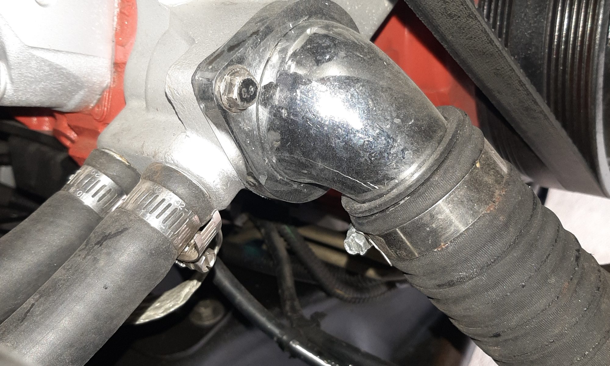 I used a Spectre 4939 swivel thermostat housing for the lower inlet because the OEM truck inlet didn’t allow for a good routing of the lower hose. On the water neck end, I used another Gates 26391 (1-3/4″-1-1/2″ reducer). This allowed me to use a Dayco 81301 (1-3/4″) 10″ flex hose to connect to the lower 1-3/4″ radiator neck.